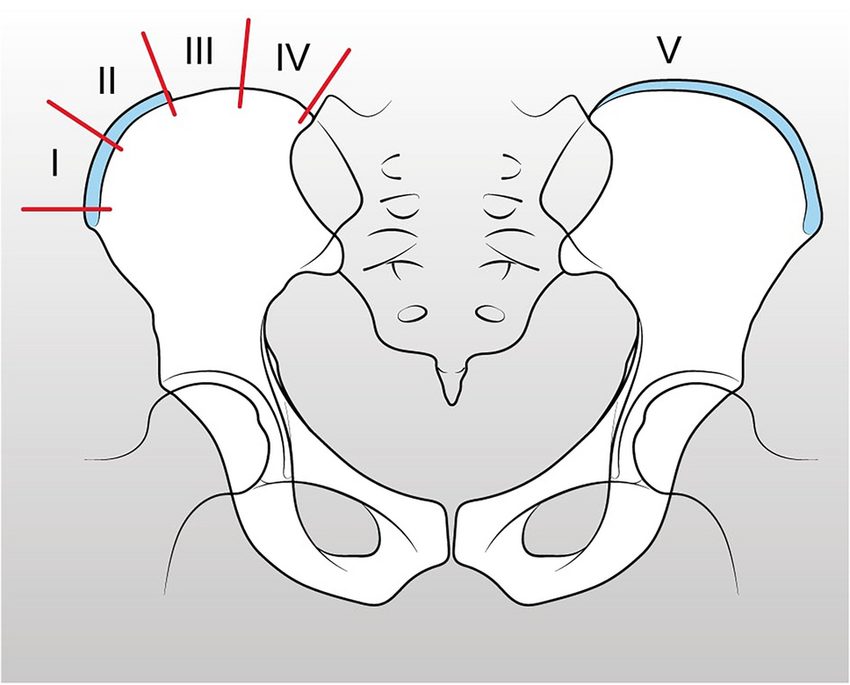 • リッサー1: 腸骨棘上部前部(前外側)骨端線の骨化(25%)、腸骨思春期前または思春期初期に見られる