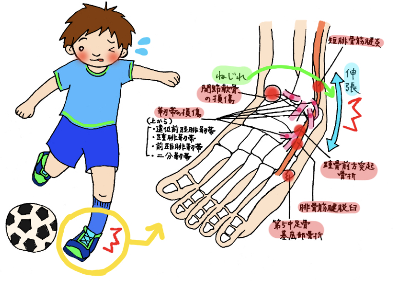 足首の捻挫は、足首の関節(距腿関節)を支える靭帯が過度に伸ばされたり、一部損傷してしまうケガのことです。特にスポーツ中や日常生活で段差を踏み外したときなどに多く起こります。